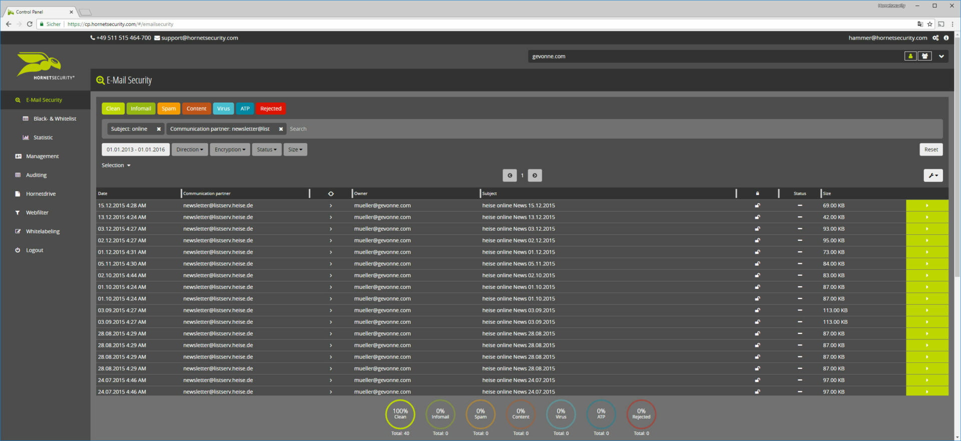 Wenn Sie E-Mails von einem oder mehreren bestimmten Absendern nicht mehr erhalten möchten, können Sie diese auf Ihre persönliche Blacklist setzen. Mit nur einem Klick direkt in Ihrem Posteingang können die angewählten Absender der Blacklist hinzugefügt werden, so dass weitere E-Mails des selben Absender nicht mehr an Sie zugestellt werden. Landet die E-Mail eines generell erwünschten Absenders fälschlicherweise in Quarantäne und erscheint daher im Spamreport, kann die Funktion “Whitelist” genutzt werden. E-Mails von Absendern auf Ihrer Whitelist werden künftig immer an Ihr Postfach zugestellt.
