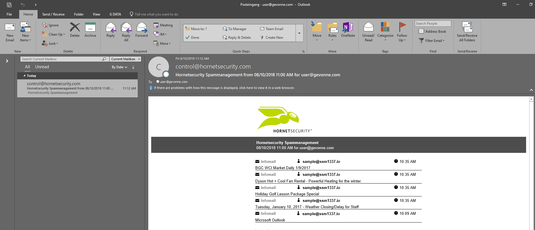 Mit dem Outlook Add-In stellt Ihnen 365 Total Protection eine Schnittstelle zur Verfügung, über die Sie die Hornetsecurity Services selbständig und intuitiv steuern können.