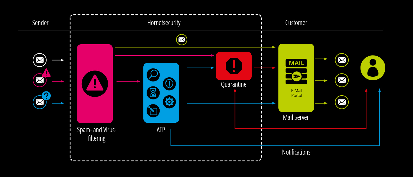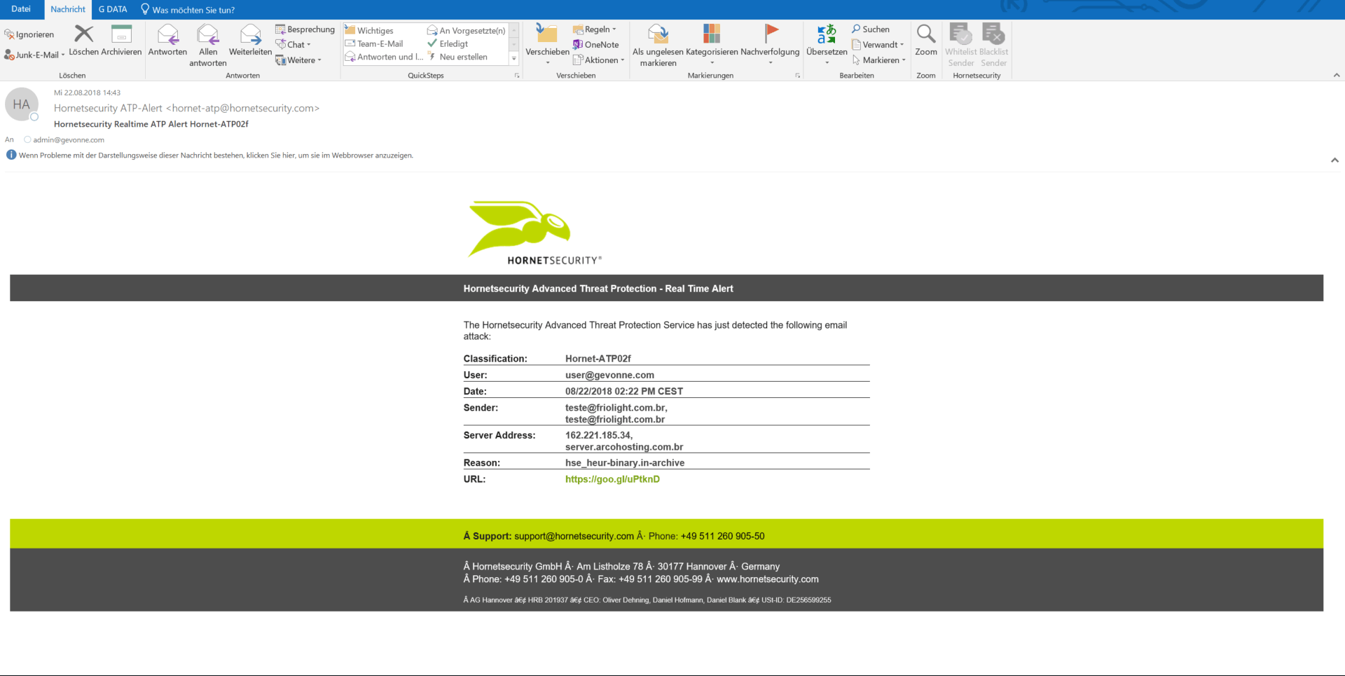 ATP-Sandboxing schützt Sie vor gezielten Angriffen und Blended Attacks. Wird beispielsweise Malware in Form eines E-Mail-Dateianhangs getarnt und eingeschleust, unterzieht Hornetsecurity ATP diesen Schädlingen weitgehende Analysen und betrachtet deren Verhalten. Sobald ein Angriff entdeckt wird, wird automatisch eine Benachrichtigung an Ihr IT-Sicherheitsteam versendet, um es unmittelbar über eine mögliche Bedrohung zu informieren.