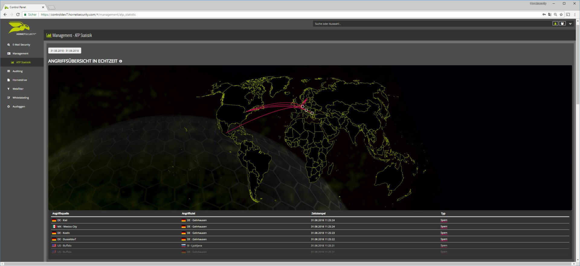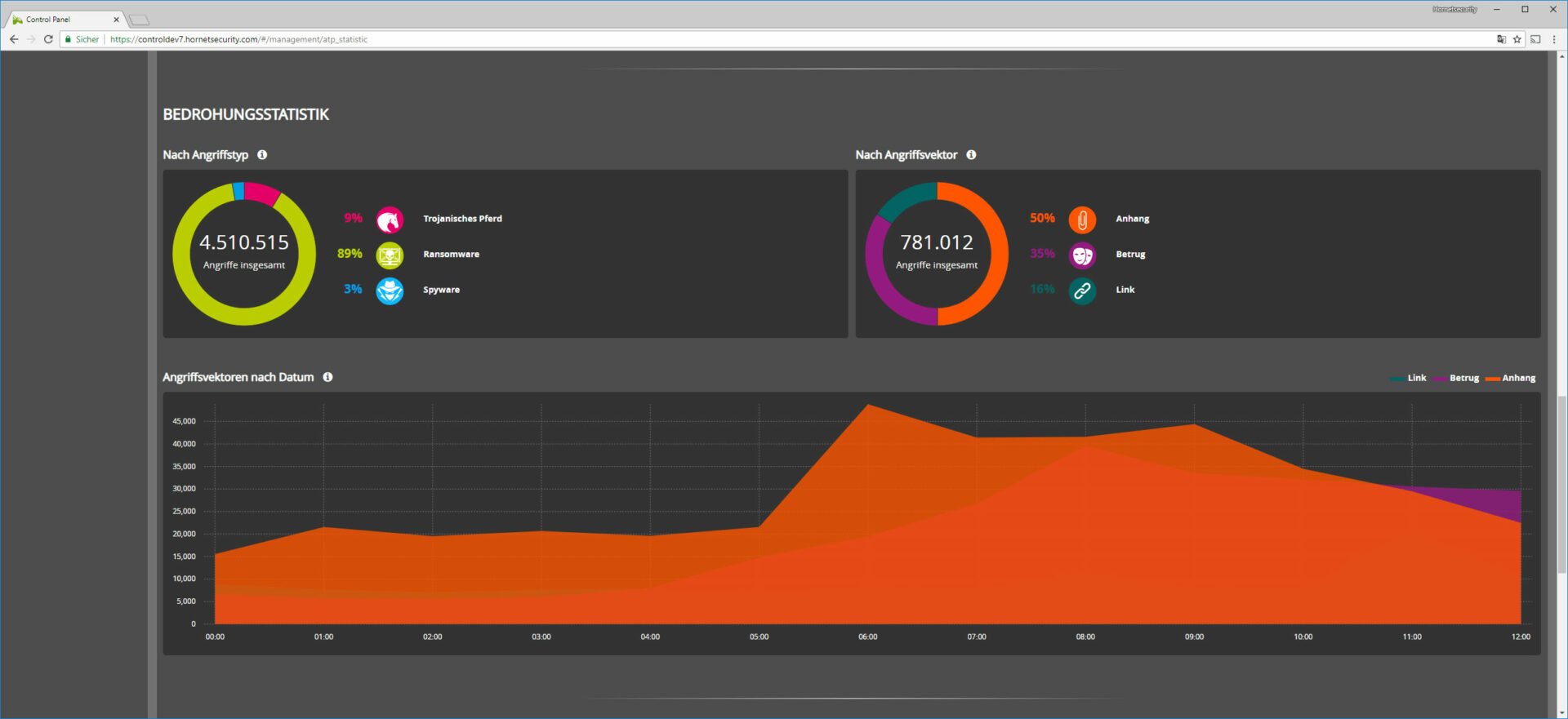 Eingehende E-Mails werden geblockt (zurückgewiesen), soweit sie noch während der Aufnahme der Datenverbindung mit den Servern von Hornetsecurity mit hoher Sicherheit als unerwünscht erkannt werden. Im Threat Blocking werden statistisch 99% der Zustellversuche von Spam zuverlässig erkannt und abgewehrt. Die darauffolgende Analyse der Threat Intelligence garantiert Ihnen eine Erkennungsrate von 99,99% bei Spam und 99,9% bei Viren.Threat Defense wird stetig durch das Hornetsecurity Security Lab weiterentwickelt und optimiert. Unter Verwendung von KI-basierten Algorithmen, Machine Learning und weiteren Technologien werden die Erkennungsmechanismen laufend erweitert – somit ist Ihre Unternehmenssicherheit potenziellen Angreifern immer einen Schritt voraus. Abgefangenen Angriffsarten, -Häufigkeiten und -Ziele werden Ihnen transparent dargestellt.