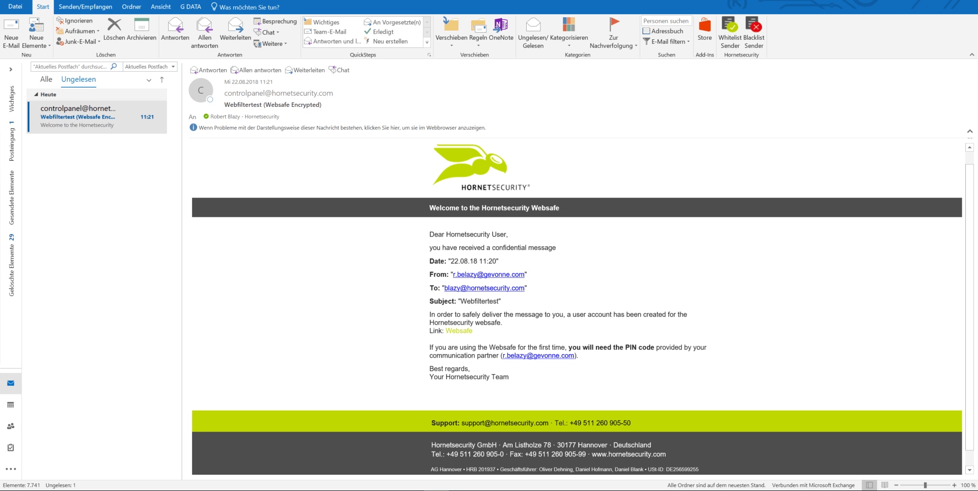 Der Kommunikationspartner ohne Verschlüsselungstechnologie erhält eine Nachricht zu seinem persönlichen Websafe-Postfach, das https- und passwortgeschützt ist. Alle zukünftigen E-Mails werden verschlüsselt zugestellt und können vom Empfänger über das Websafe-Postfach eingesehen werden.