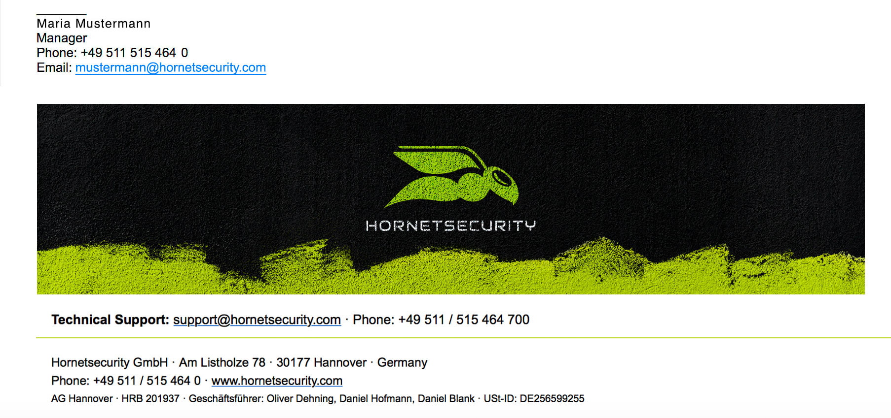 Company Disclaimer werden zur Einhaltung gesetzlicher Vorschriften verwendet. Mit der zentralen “Company Disclaimer”-Funktion von 365 Total Protection können Sie die unternehmensweite Einbindung der rechtskonform gestalteten Unternehmensinformationen sicherstellen.
