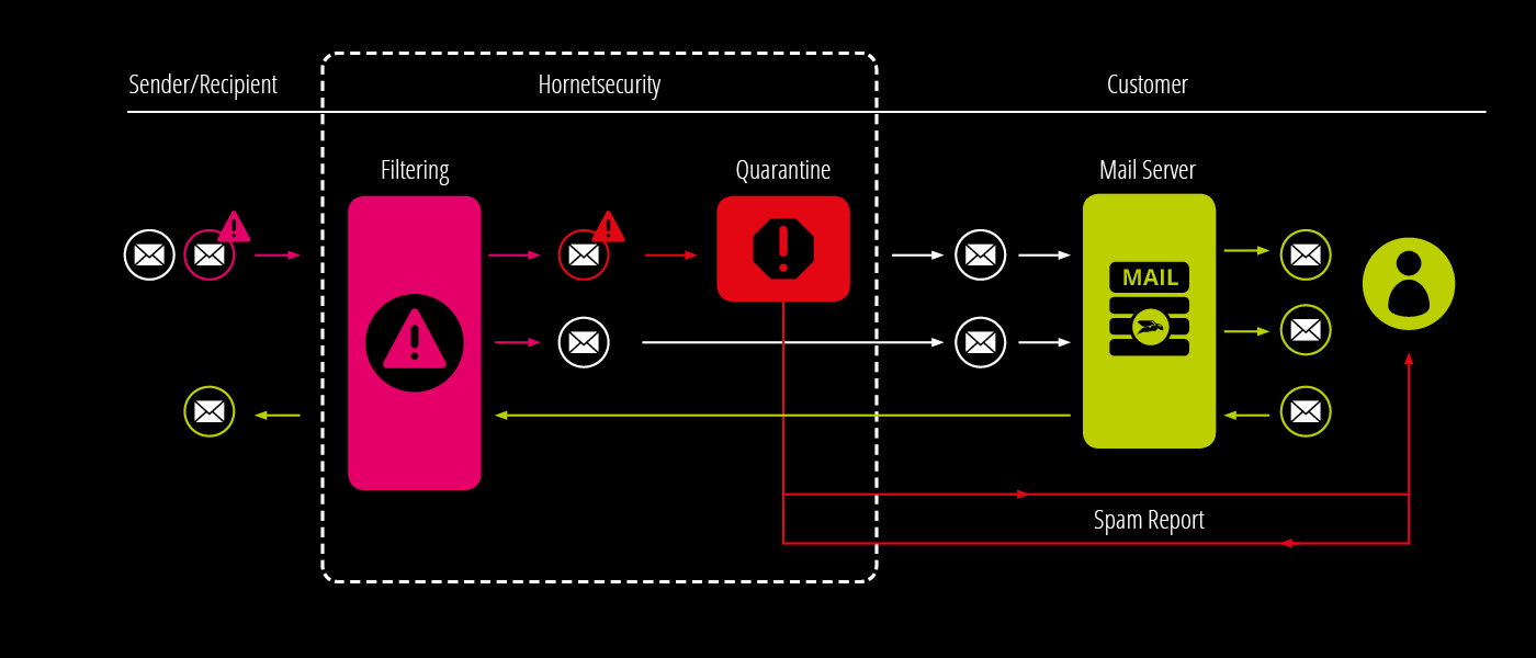 E-Mails mit unerwünschten Dateianhängen werden direkt quarantäiniesiert oder wahlweise ohne Anhang an den Empfänger weitergeleitet. Der Empfänger wird im selben Zuge darüber informiert.