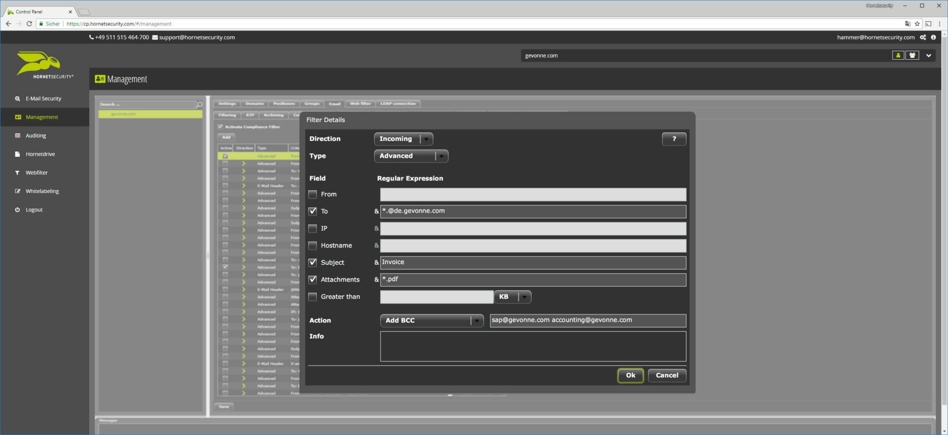 Der Compliance Filter erweitert die Filterfunktionen um ein Vielfaches, wobei der ein- und ausgehende E-Mail-Verkehr automatisch nach selbstdefinierten Filterregeln geprüft werden kann.
