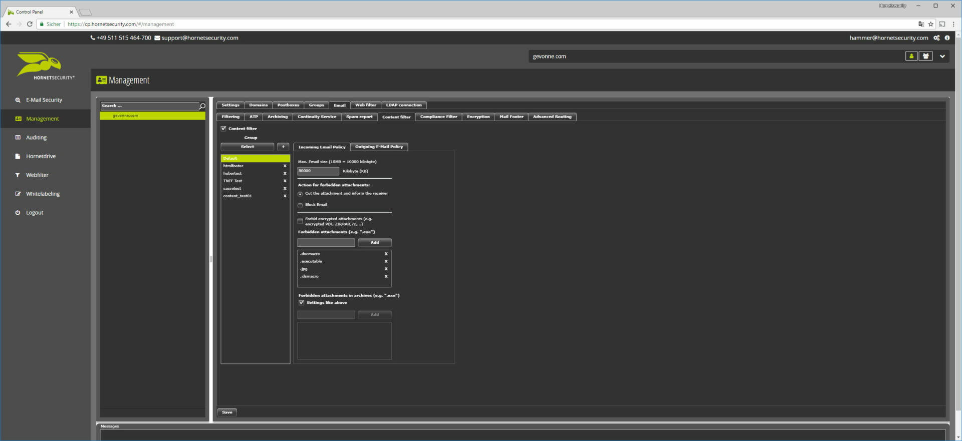 Content Control schützt Ihre E-Mail-Kommunikation vor dem Eindringen und dem Versand unerwünschter oder unerlaubter Dateianhänge gemäß Ihrer Firmen-Policy. Bei der Steuerung von Content Control können beispielsweise in der Default-Gruppe (Postfächer, die keiner gesonderten Gruppe zugewiesen sind) Sammelbegriffe und Kategorien (z. B. .docmacro oder .executable) gesperrt sein. Für eine Abteilung wie das Marketing kann jedoch hingegen der Empfang von Mediafiles und Makros im Tagesgeschäft erforderlich sein: So kann man z.B. eine Gruppe für das Marketing anlegen und im Content Control einstellen, dass für diese Gruppe nur die potenziell gefährlichen z.B. .executable-Dateiformate blockiert werden.