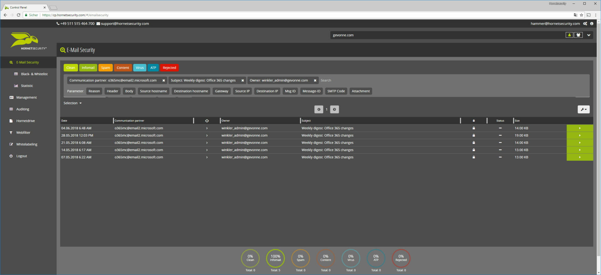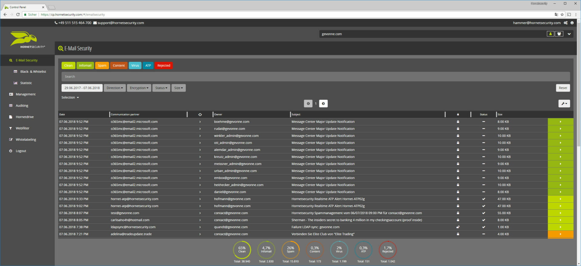 Mit umfangreichen Filtermöglichkeiten unterstützt das Live-Tracking das schnelle und unkomplizierte Auffinden bestimmter E-Mails. Mails in der Quarantäne können vom Benutzer direkt aus dem Company Security Management heraus ausgelöst und zugestellt werden. Aktionen wie Black- oder Whitelisting können ebenfalls durchgeführt werden.