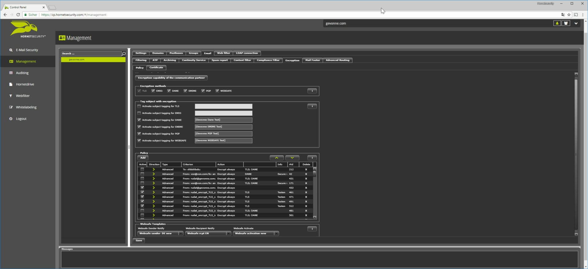 365 Total Protection bietet mit Secure Cipher Policy Control die Möglichkeit, die verwendeten Sicherheitskriterien der E-Mail-Kommunikation per Mausklick zu definieren und an Ihre Anforderungen und Ihre Firmen Policy anzupassen.