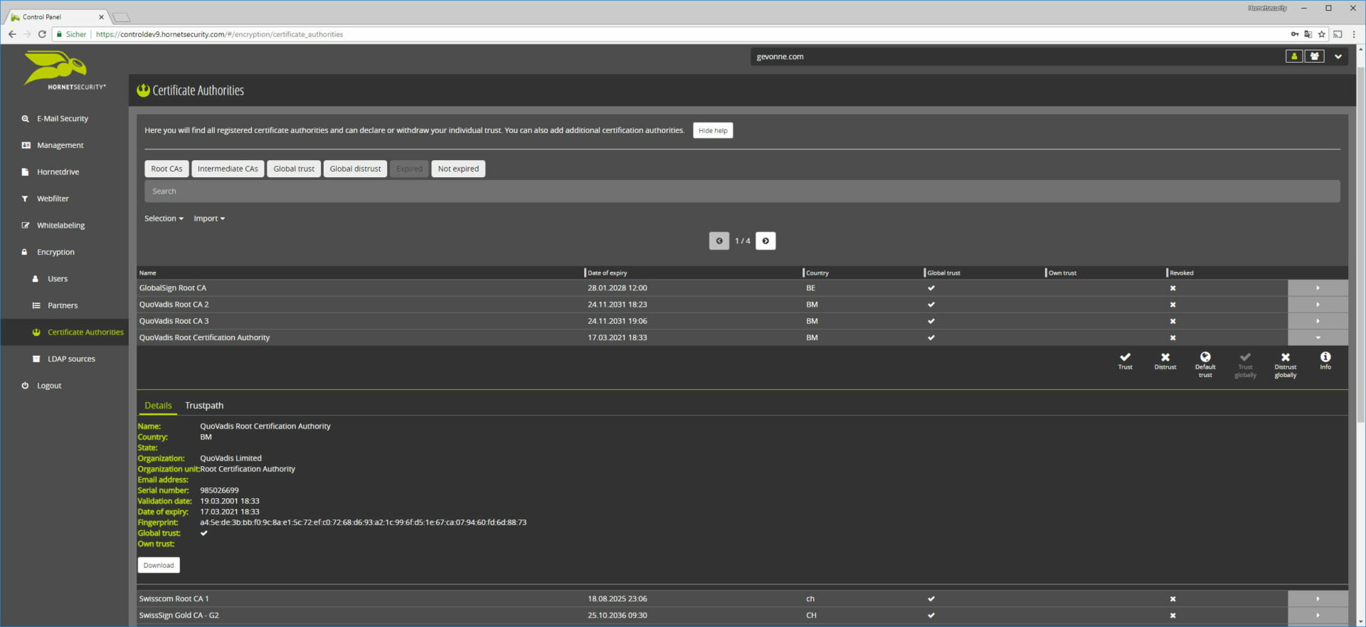 Im Rahmen von Secure Cipher Policy Control können Sie die Vertrauenseinstellungen für Zertifizierungsstellen feingranular definieren. Einstellungen können auf Benutzerbasis vom Administrator zentralisiert vorgenommen werden. Ein Export der öffentlichen Schlüssel ist direkt aus dem Frontend möglich.