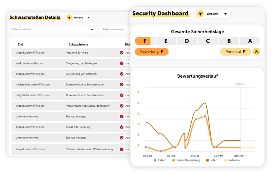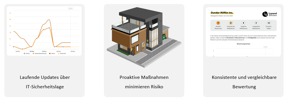 Wir bewerten einfach, schnell, verständlich, kontinuierlich und kostengünstig die aktuelle Sicherheitslage eurer digitalen Infrastruktur und zeigen Schritt für Schritt auf, welche Maßnahmen wir gemeinsam umsetzen.