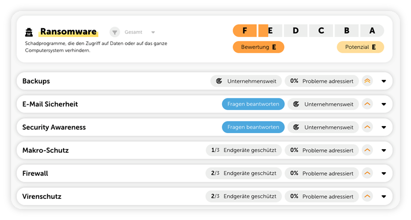 4. Im Anschluss daran wird der Sicherheitszustand des Unternehmens auf einfache Art und Weise visuell dargestellt. Bereits priorisierte Maßnahmen sollen dabei helfen, an den wichtigsten Schrauben zuerst zu drehen. Die vorgeschlagenen Maßnahmen können anschließend in einem sogenannten „Renovierungsplan“ geplant werden.